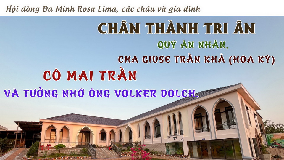 Hội dòng Đa Minh Rosa Lima, các cháu và gia đình xin hết lòng tri ân đến quý ân nhân, cha Giuse Trần Khả (Houston – Hoa Kỳ), đặc biệt là tri ân Cô Mai Trần và tưởng nhớ ông Volker Dolch. Nguyện xin ơn trên ban sức khỏe và niềm vui mỗi ngày trên Cô Mai Tran – Dolch và xin cho Ông Volker Dolch được hưởng vinh phúc trên trời để từ trên cao Ông cũng luôn mỉm cười với các cháu mỗi ngày như khuôn mặt hiền hậu của Ông nơi di ảnh. Kể sao xiết được gương mặt rạng rỡ của các cháu và các dì phụ trách trong ngày Khánh Thành làm phép ngôi nhà.