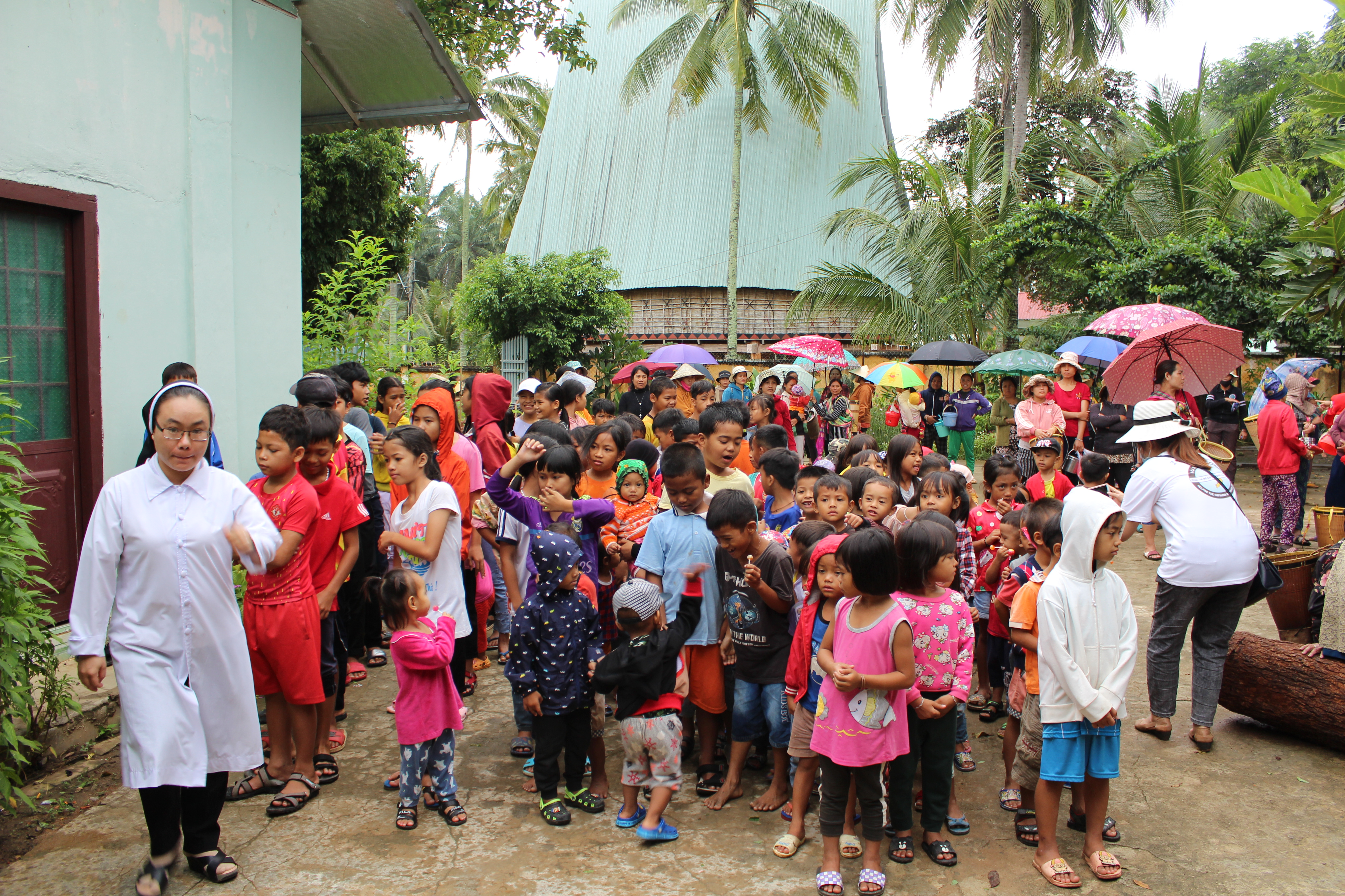 Hơn 10h sáng, mưa bão số 5 đã ùa ngập muôn lối. Trên con đường làng dẫn đến cộng đoàn quý sơ Dòng Ảnh Đức Mẹ, những bệnh nhân phong chậm rãi từng bước chân, họ đến đây để ăn trưa do quý sơ Đa Minh Rosa Lima cùng HBAP tổ chức, những việc mà họ đã quen trong suốt quãng đời “làm cư dân” ở làng phong này.