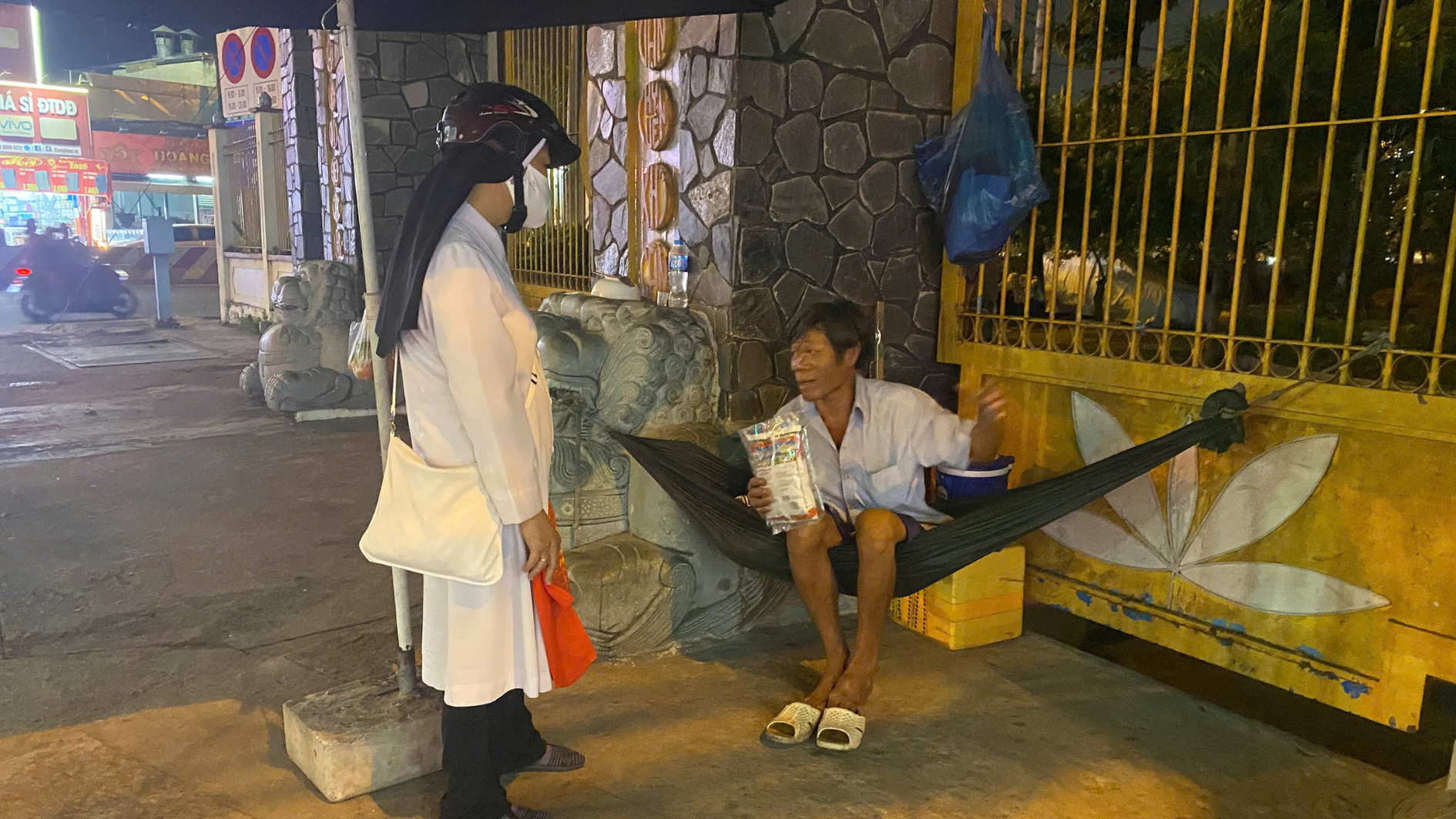 Ông T với chiếc võng cũ tá túc bên cổng chùa