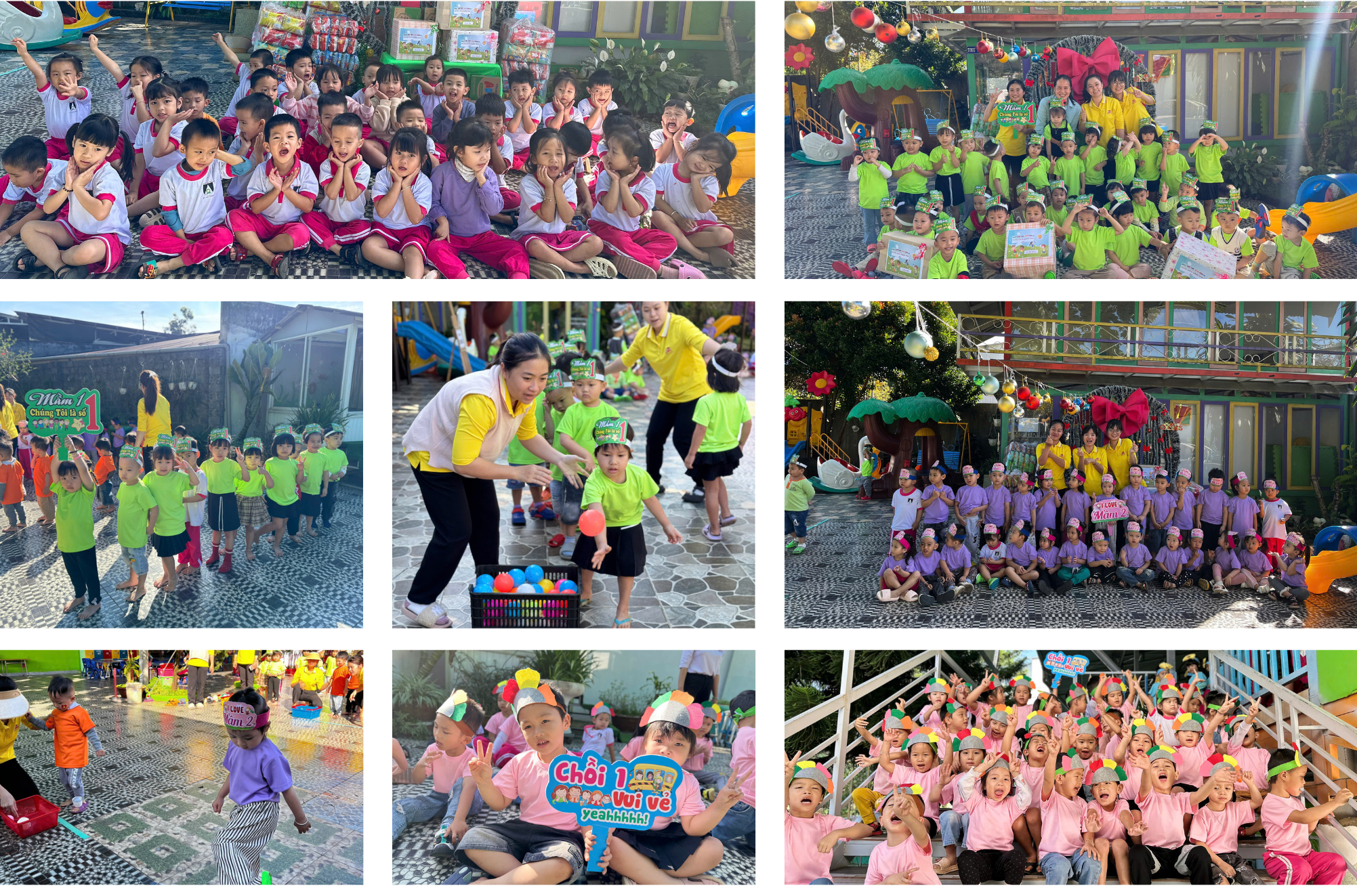 Từ sáng sớm, sân trường đã rộn ràng tiếng cười khi các em nhỏ tham gia các trò chơi như nhảy bao bố, chuyền nước, cướp cờ và ném bóng. Những trò chơi này không chỉ mang lại niềm vui mà còn giúp các bé rèn luyện thể chất và phát triển tinh thần đồng đội.