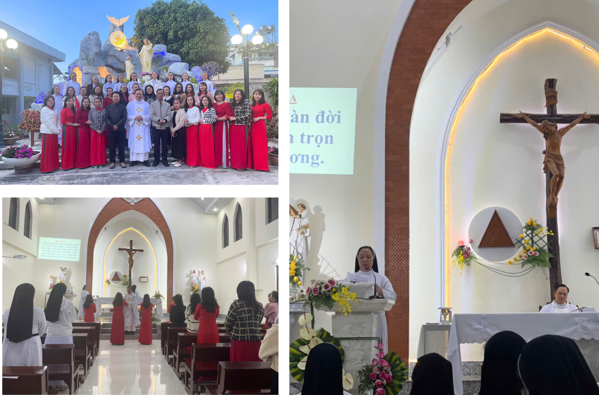 Vào lúc 5g00 thánh lễ tạ ơn đã được cử hành tại Nguyện đường Tu viện do Cha Vinh Sơn Nguyễn Duy Nam chủ tế. Trong không gian yên bình ấy, quý sơ, quý cô giáo và phụ huynh hướng lòng về Chúa với tâm tình tạ ơn vì những ân phúc Chúa ban trong năm qua và hy vọng cho một năm mới an lành, khởi sắc.