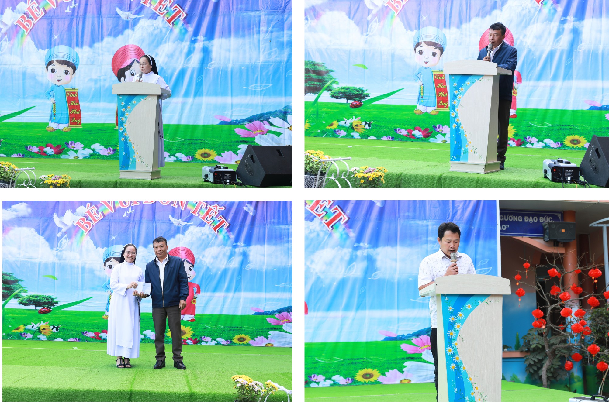 Mở đầu chương trình là tiết mục múa “Bức họa đồng quê” của các bé lớp Lá 2, mang đến hình ảnh thanh bình của làng quê qua từng bước chân nhịp nhàng. Dì Hiệu trưởng đã thay mặt nhà trường chia sẻ về những thành tựu đạt được trong học kỳ vừa qua, như một lời động viên và khích lệ cho cả cô trò trong hành trình phía trước. Tiếp theo, các đại diện từ xã Lạc Lâm gửi lời chúc mừng và những món quà nhỏ nhưng đầy ý nghĩa, thể hiện sự quan tâm đặc biệt đến nhà trường. Đại diện Ban phụ huynh cũng chia sẻ những lời chúc tốt đẹp, mong muốn một năm mới tràn đầy yêu thương và thành công.